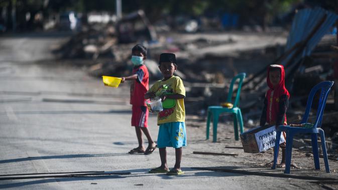 Anak-anak yang terkena dampak gempa meminta sumbangan pada pengguna jalan yang melintas di desa di Loli Pesua, Donggala, Selasa (2/10). Akibat terlambatnya pasokan bantuan, mereka terpaksa meminta sumbangan hingga turun ke jalan. (AFP PHOTO / ADEK BERRY)