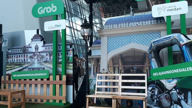 Liputan6.com, Jakarta - Perusahaan mobile platform Grab membuka booth foto bertemakan tempat paling top pariwisata yang ada di Indonesia, di selasar Terminal 3 Bandara Internasional Soekarno Hatta, Kota Tangerang, Jumat (26/10/2018).