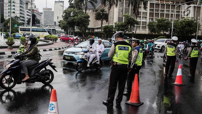 Petugas Dishub mengalihakan arus lalu lintas terkait Malam Munajat 212 di Medan Merdeka Barat dan Utara, Jakarta, Kamis (21/2). Masyarakat yang akan melintasi kawasan Monas diharapkan mencari jalur alternatif. (Liputan6.com/Faizal Fanani)