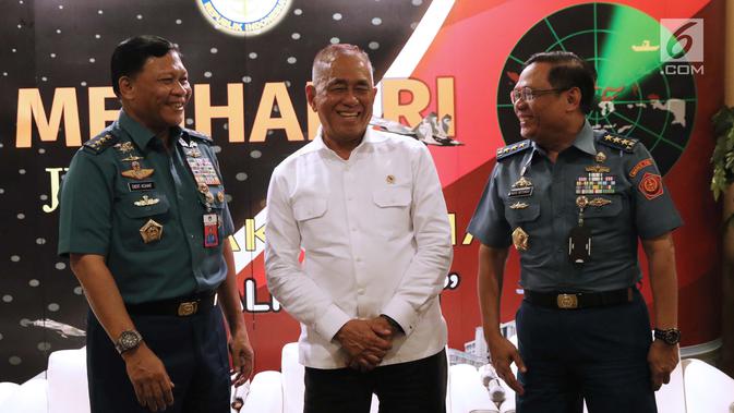 Menteri Pertahanan, Ryamizard Ryacudu (tengah) bersama Irjen Kemhan, Laksamana Madya TNI Didit Herdiawan Ashaf dan Sekjen Kemhan, Laksamana Madya TNI Agus Setiadji usai memberi keterangan terkait netralitas TNI di Jakarta, Senin (15/4). (Liputan6.com/Helmi Fithriansyah)