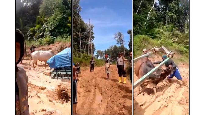 Medan yang dilalui adalah jalan tanah yang berlumpur dan ada sapi yang mogok mungkin karena kelelahan.