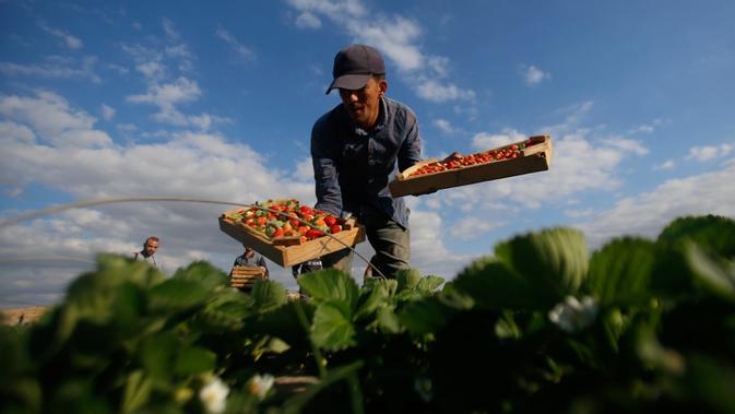 Para petani memetik stroberi di sebuah kebun, Beit Lahyia, Jalur Gaza, Selasa (3/12/2019). Tidak semua tanah di Gaza bagus untuk ditanami stroberi, hanya di wilayah utara saja yang bagus untuk ditanami buah dan sayur. (AP Photo/Hatem Moussa)
