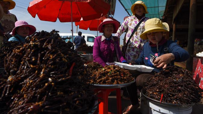 Pengendara motor membeli tarantula goreng yang dijajakan pedagang di wilayah Skun, Provinsi Kampong Cham, Kamboja, 4 Desember 2019. Daerah yang kerap dijuluki "Spiderville" tersebut menjadi tempat menarik bagi para turis berburu aping, camilan tradisional dari tarantula ini. (TANG CHHIN Sothy / AFP)