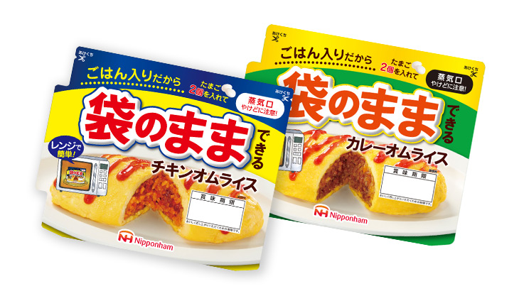 「袋のままできるオムライス」は、袋に入ったチキンライス(カレー味もあり)に溶き卵を入れて、電子レンジで温めるとオムライスが完成します。