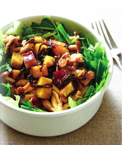 1. さつまいもは1センチ角に切って水にさらし、しめじは石づきを取って小房に分け、レタスは一口サイズにちぎり、水菜は4センチに切る