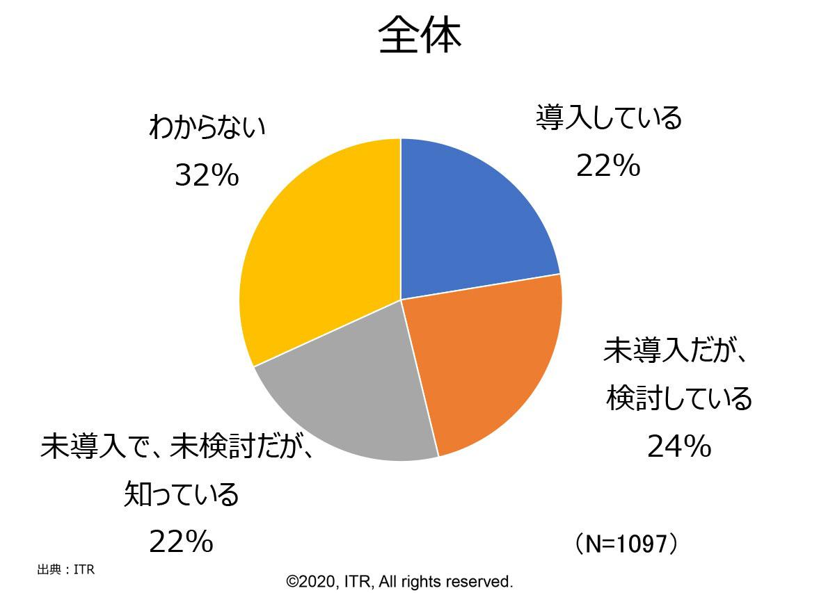 IDaaSの導入状況と市場規模について見ていこう。IDaaSは、ITRの調査によれば、企業の約2割しか導入されていない。検討中の数字も加えると、IDaaS導入に積極的な企業は約5割に近い。