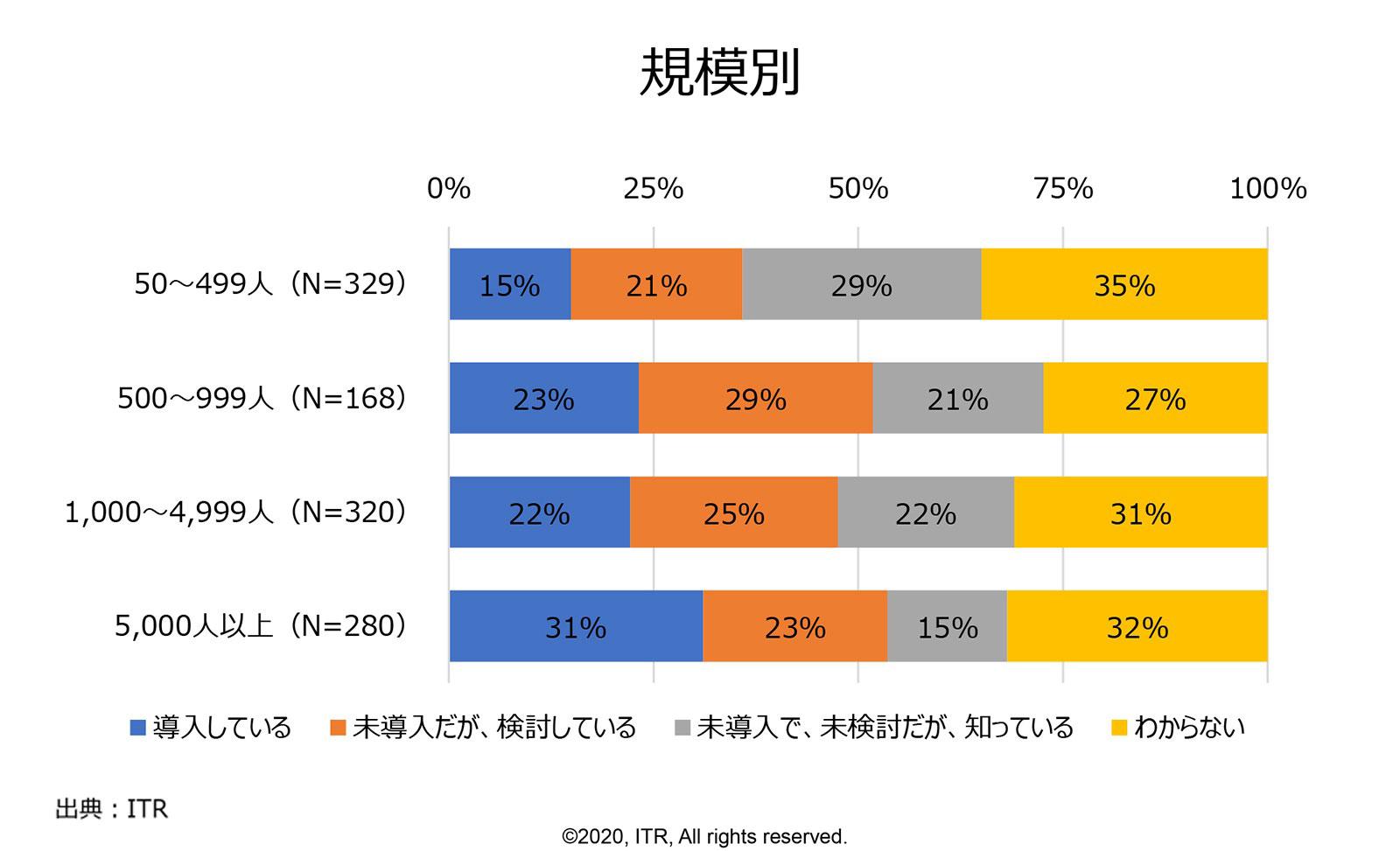 また、企業規模の大きな組織ほど、IDaaSの導入が進んでいる。次の図は企業の規模別にIDaaSを導入しているかどうかを示したITR調査のグラフだ。
