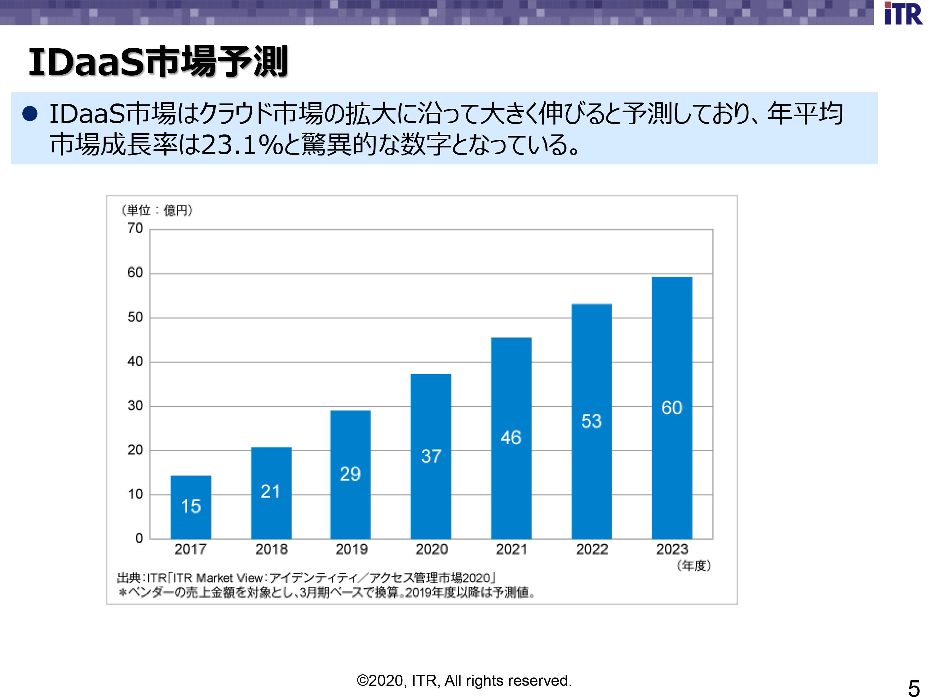ITRによれば、IDaaS市場は、年平均市場成長率は23.1%と大きな伸びを示している。IDaaSが今後も大きく成長を遂げるためには、社内システム全体をクラウド化またはSaaS化する企業の増加が前提だ。