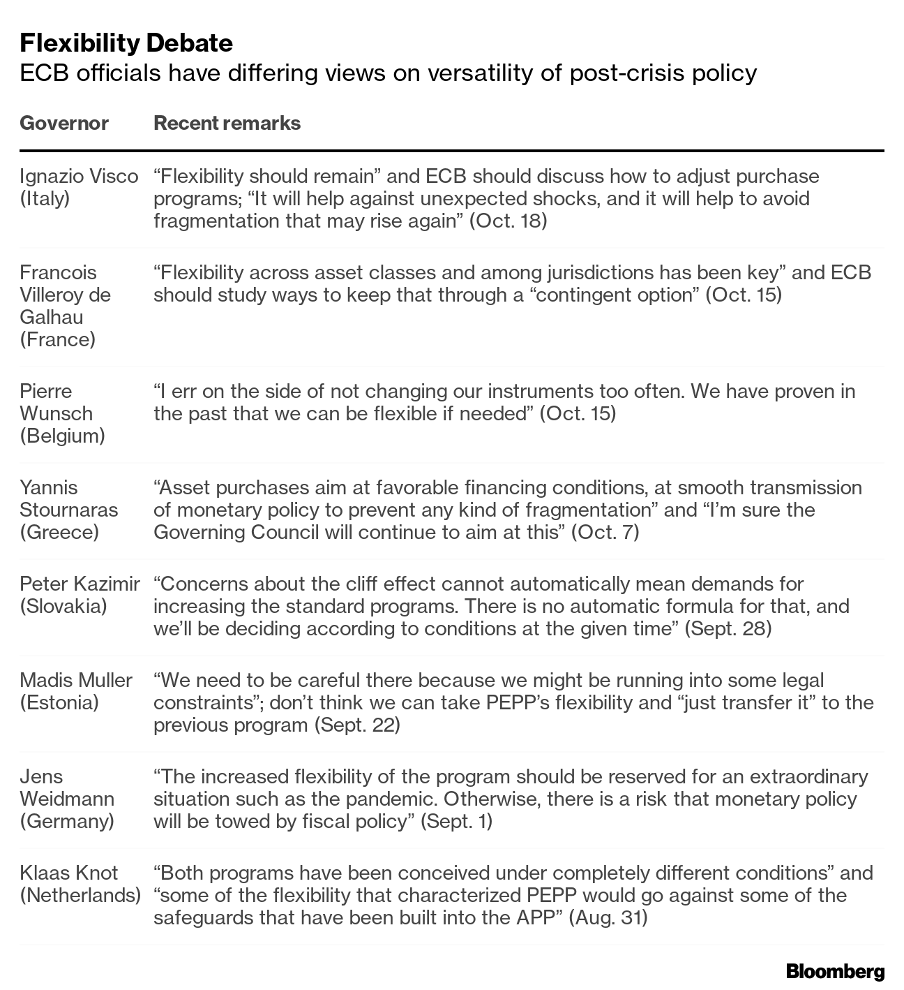欧州中央銀行(ECB)当局者は、ポストコロナの金融刺激プログラムに「柔軟性」を求めているが、それが修正可能な余地を意味するのか、それとも潜在的拡張の余地を意味するのか、意見が完全には一致していない。