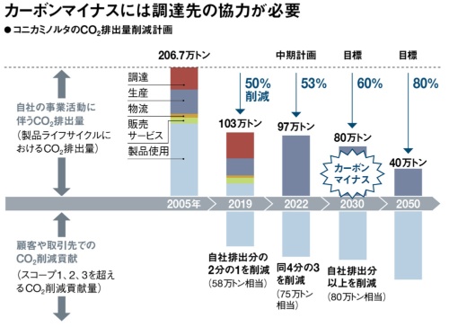 30年に「カーボンマイナス」を実現する──。コニカミノルタが掲げる野心的な目標だ。カーボンマイナス達成を可能にするのが、サプライヤーとの共同活動だ。世界的なガイドライン「GHGプロトコル」では、温暖化ガス排出量を算出する範囲を3つに分けている。自社の工場内で排出する「スコープ1」、使用するエネルギーを生み出す際に排出する「スコープ2」。原材料の生産や輸送、自社製品を顧客が使う際に出る「スコープ3」である。