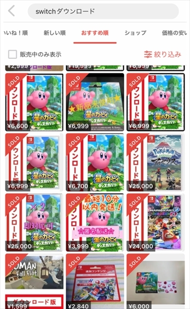 実際にメルカリを見てみると、確かにNintendo SwitchのDL版ゲームが販売されている様子が確認できます。価格については、普通に定価近くで販売しているものもあれば、妙に安かったり高かったりするものもあり、転売だとしてもやや不自然。「2本で2万3800円」のようなセットは誰が買ってるの……?