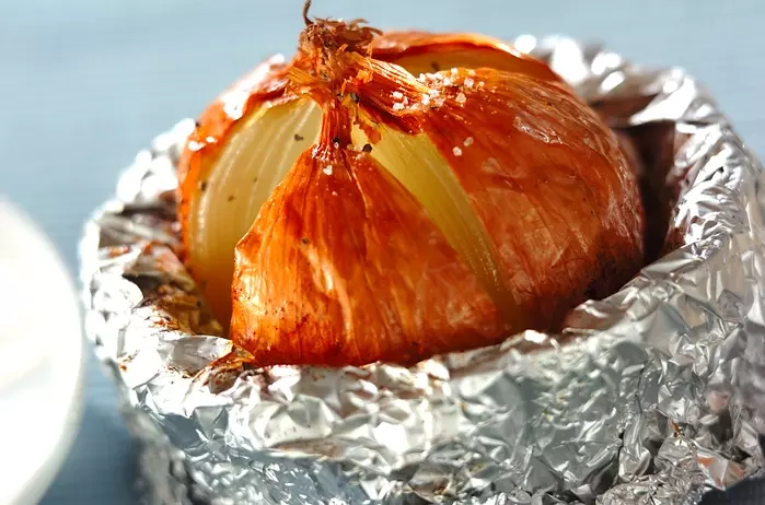 皮のままの玉ネギをホイルで焼きます。トロトロになった玉ネギは甘味が凝縮されて絶品!