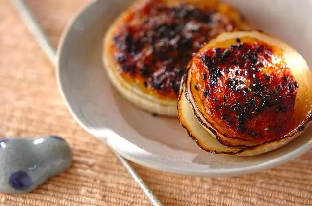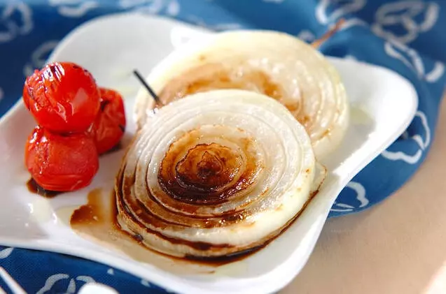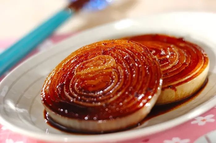 玉ネギを蒸し焼きにした後にしょうゆやみりんで味付けをした食べ応えのある玉ネギステーキ。隠し味のバルサミコ酢が味に深みを出しています。楊枝を刺して焼くと綺麗な形がキープできます。