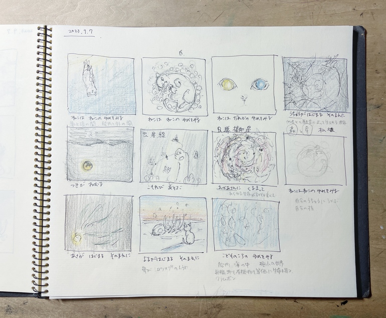 今回、絵本『ねこはねこのゆめをみる』の「文」を創作するにあたって、今までに感じたことのない違和感を憶えた。それは執筆時にイメージがまったく喚起されないというとても奇妙なものだった。絵本における「文」はアニメーションにおける「脚本&絵コンテ」と同じだとばかり考えていたが、どうやらまったく違うらしい。そもそも絵本にはカットを割るとかカメラワークを考えるという概念がないのだ。ただ純粋にページをめくるだけ。ページをめくることがモンタージュであると言えなくもないが、アニメーション(映画)特有の運動イメージの不在に起因するものだろうか、まったく絵が浮かばないのだ。それを逆手にとって私はこの状況を大いに愉しみありふれた単語を使いながら韻を踏んだり主客を軽やかに転倒させたりなどして文字の裏側に潜む抽象的な情景を生み出した。「絵」を担当する鋤柄氏の生みの苦しみは如何に。