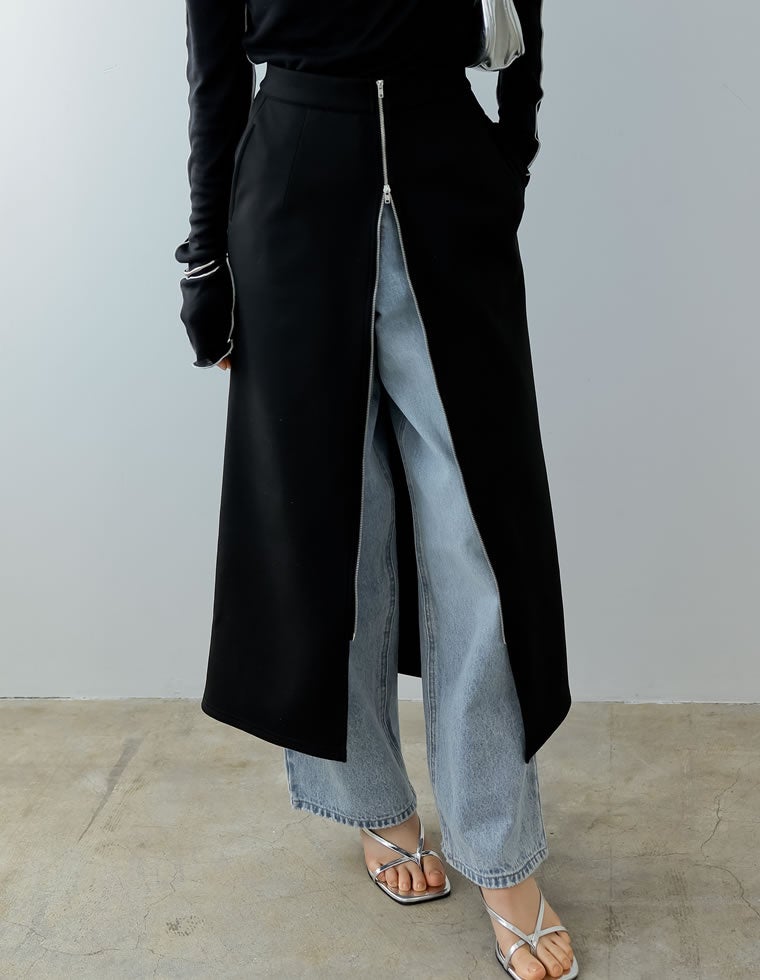 フロントに大胆に入ったダブルジップがモードな印象のスカート。